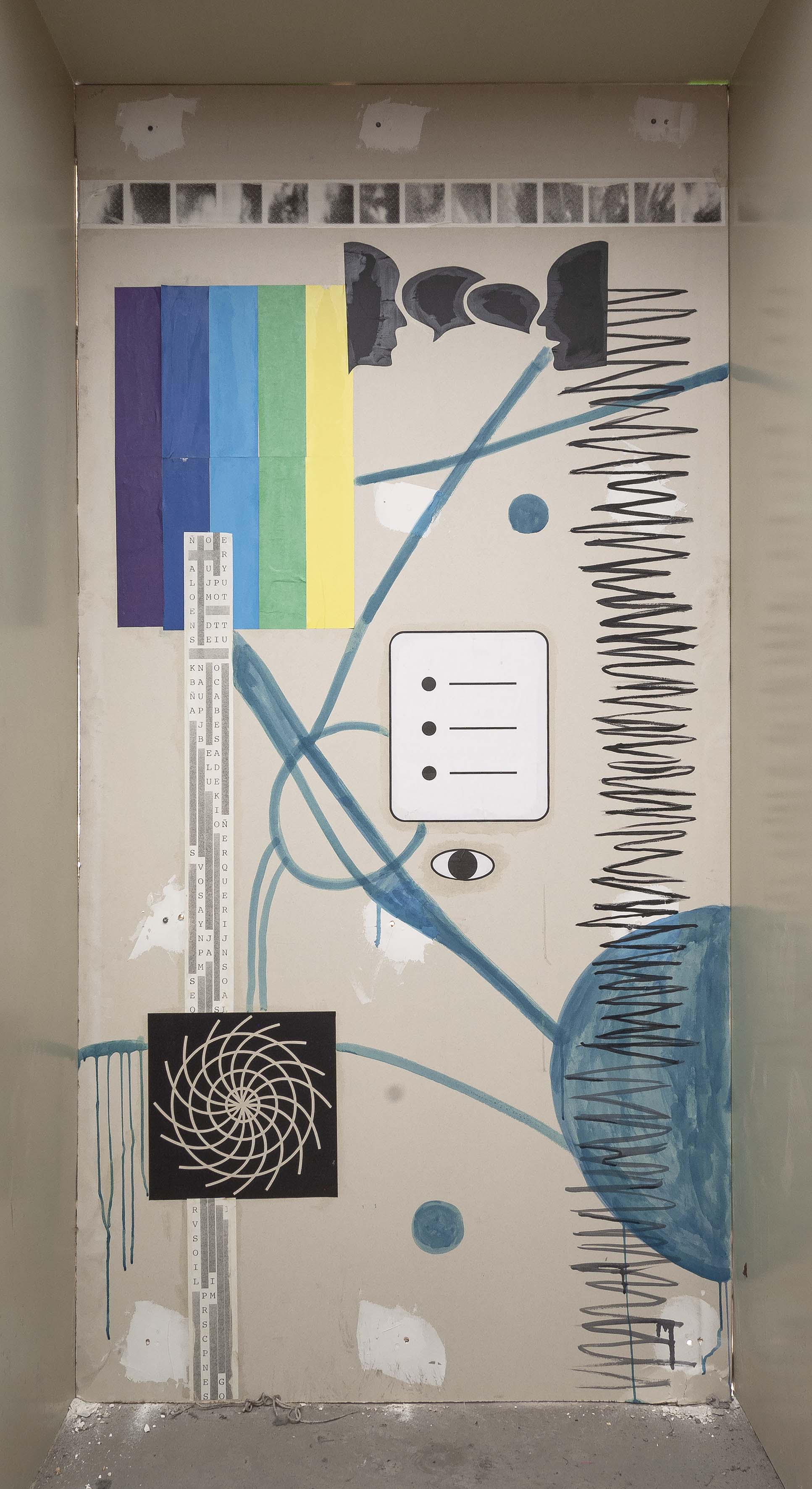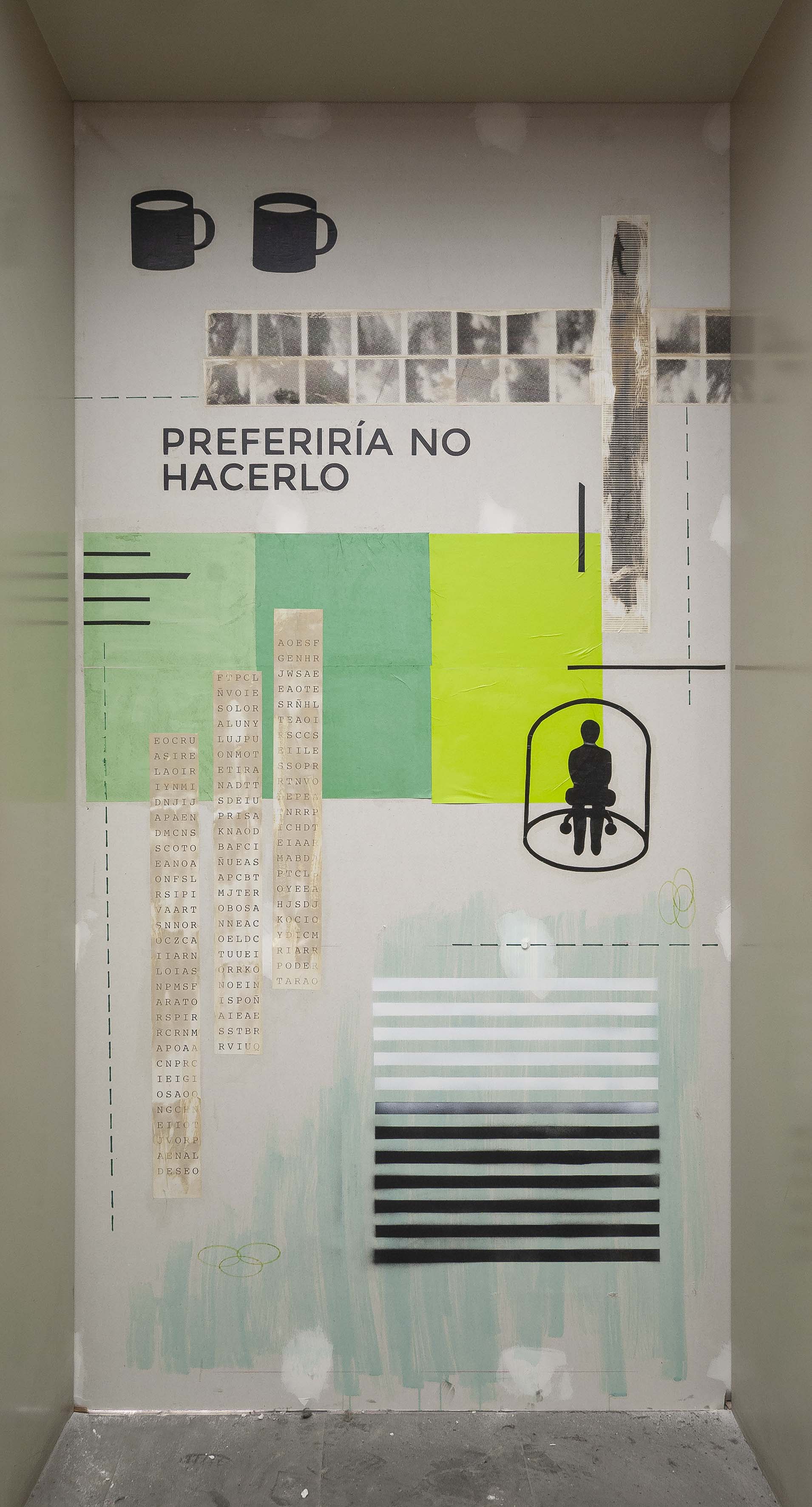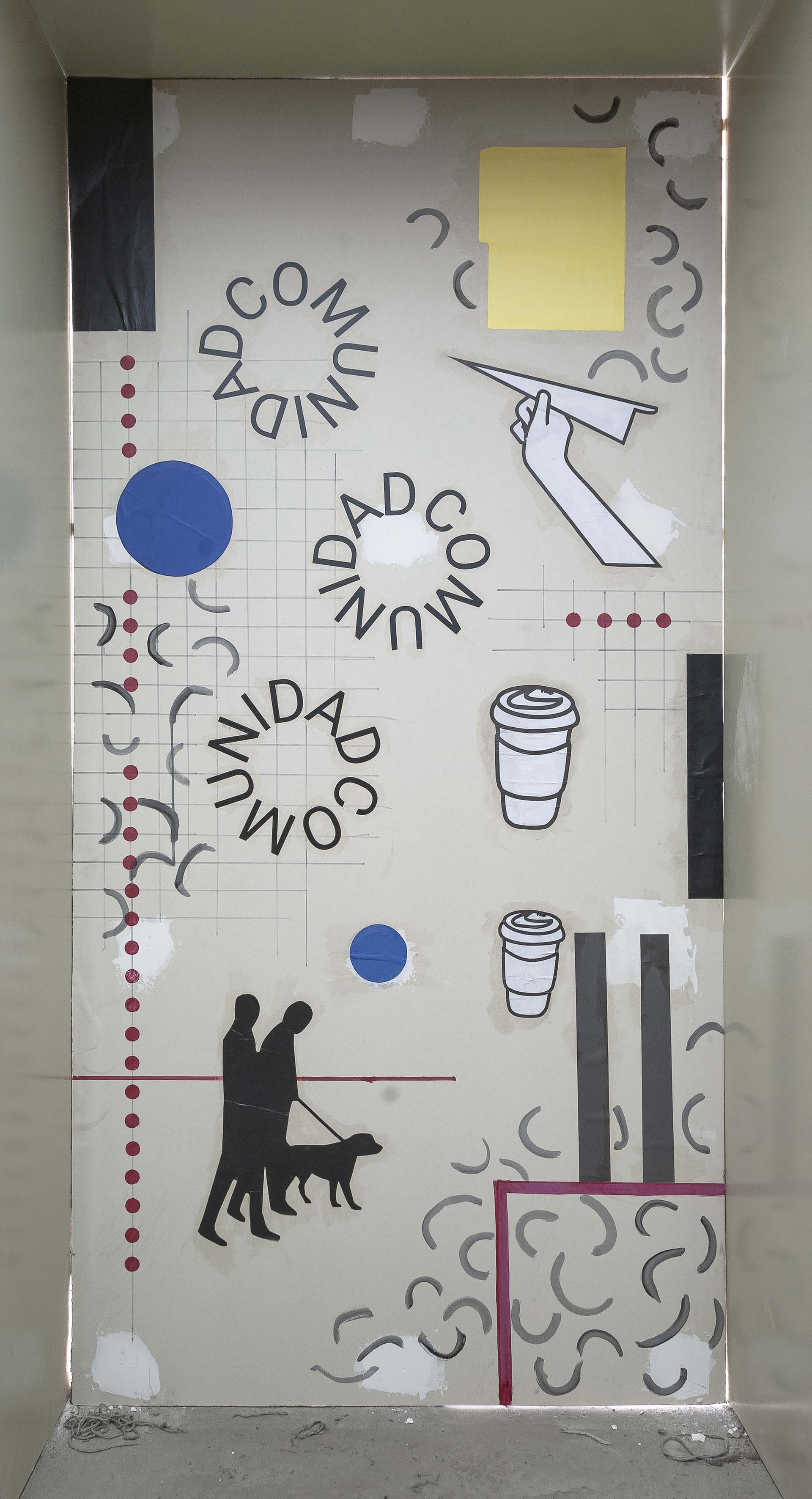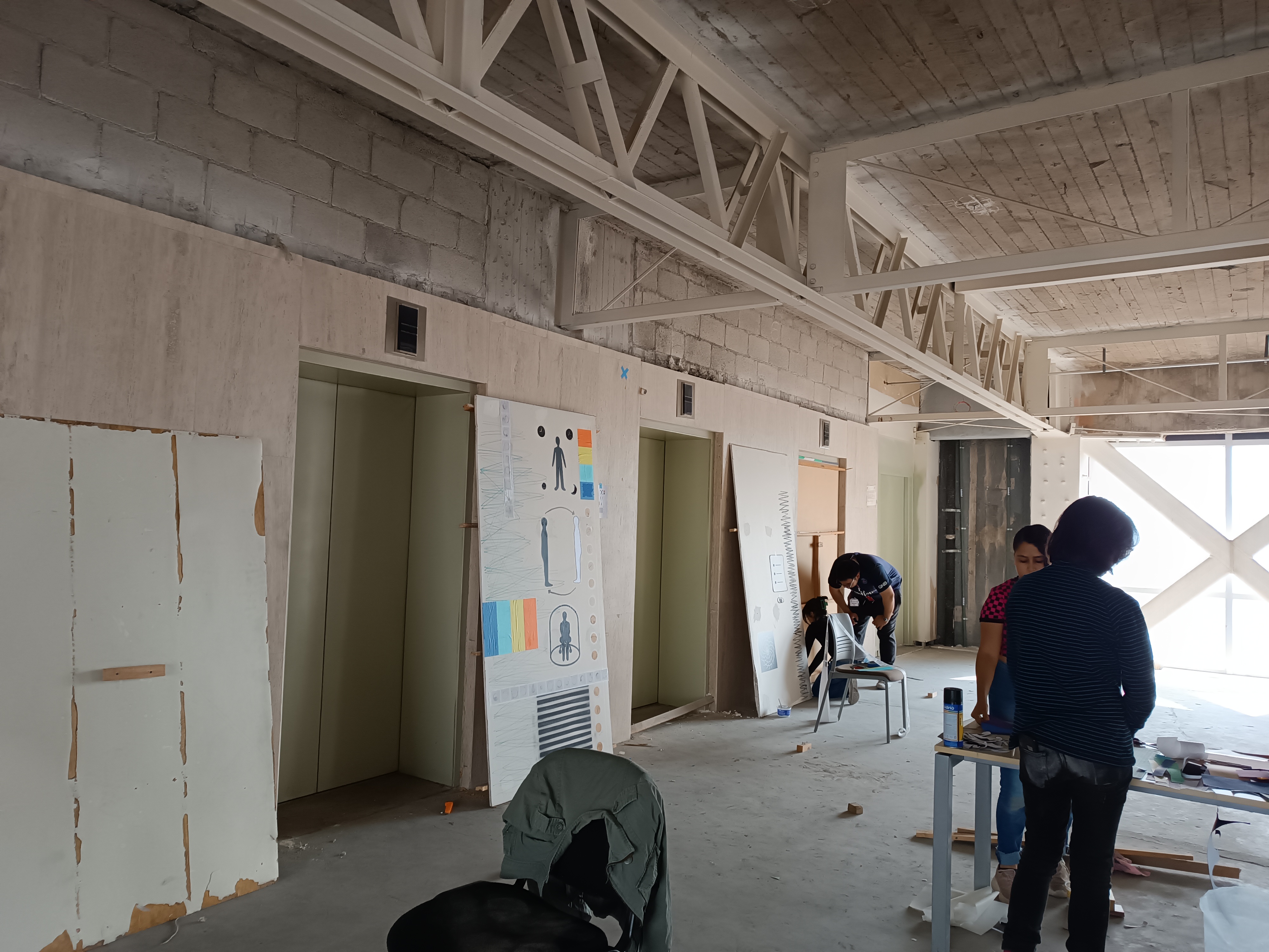 Intervención de tapiales en elevadores de la Torre UNAM Tlatelolco. Hay un total de 24 tapiales intervenidos, 4 piezas por cada piso vacío que son el 1°, 2°, 14°, 15°, 17°, 18°. Estos collages fueron realizados a partir de las experiencias compartidas de trabajadores de la Torre.