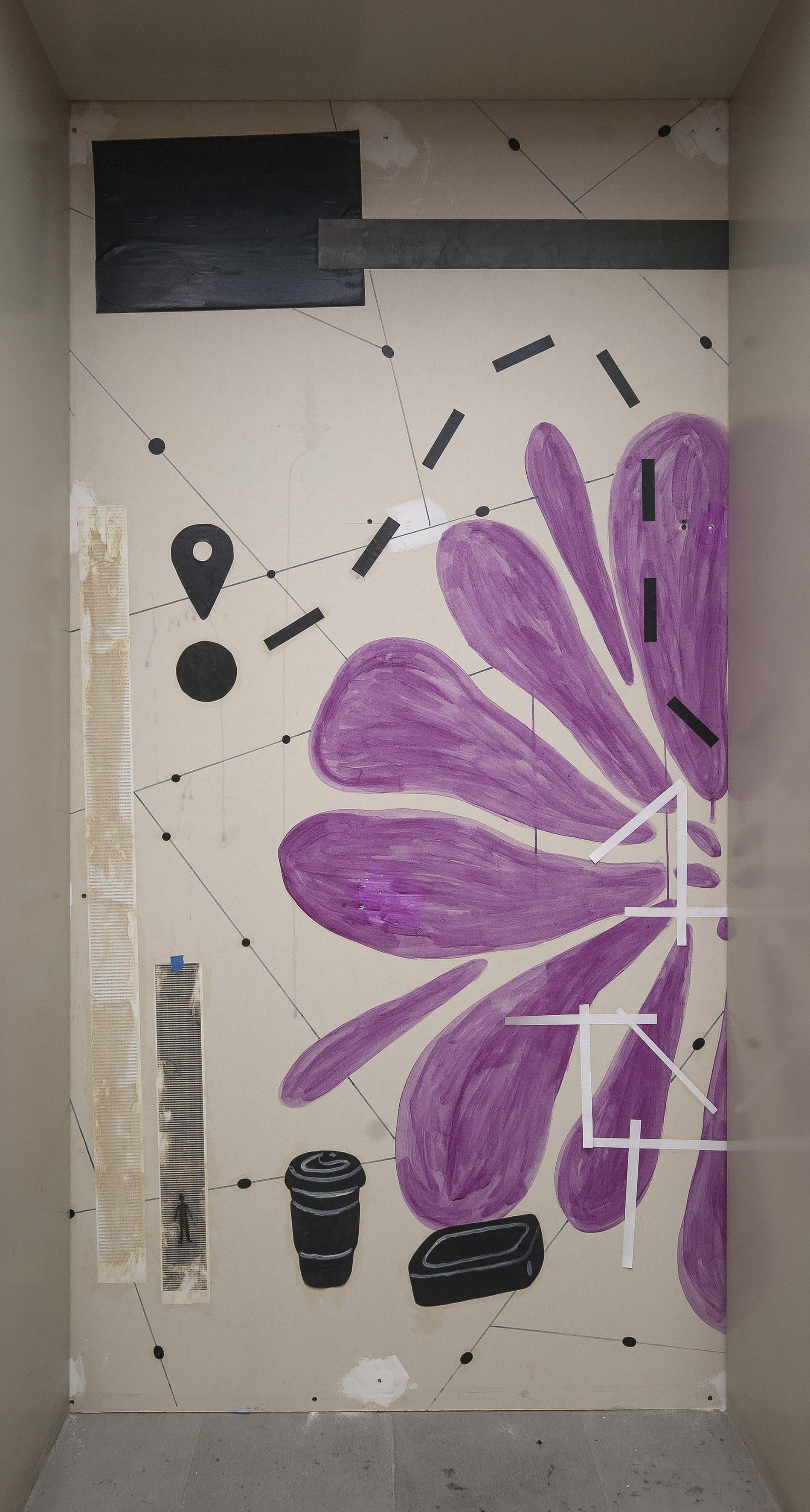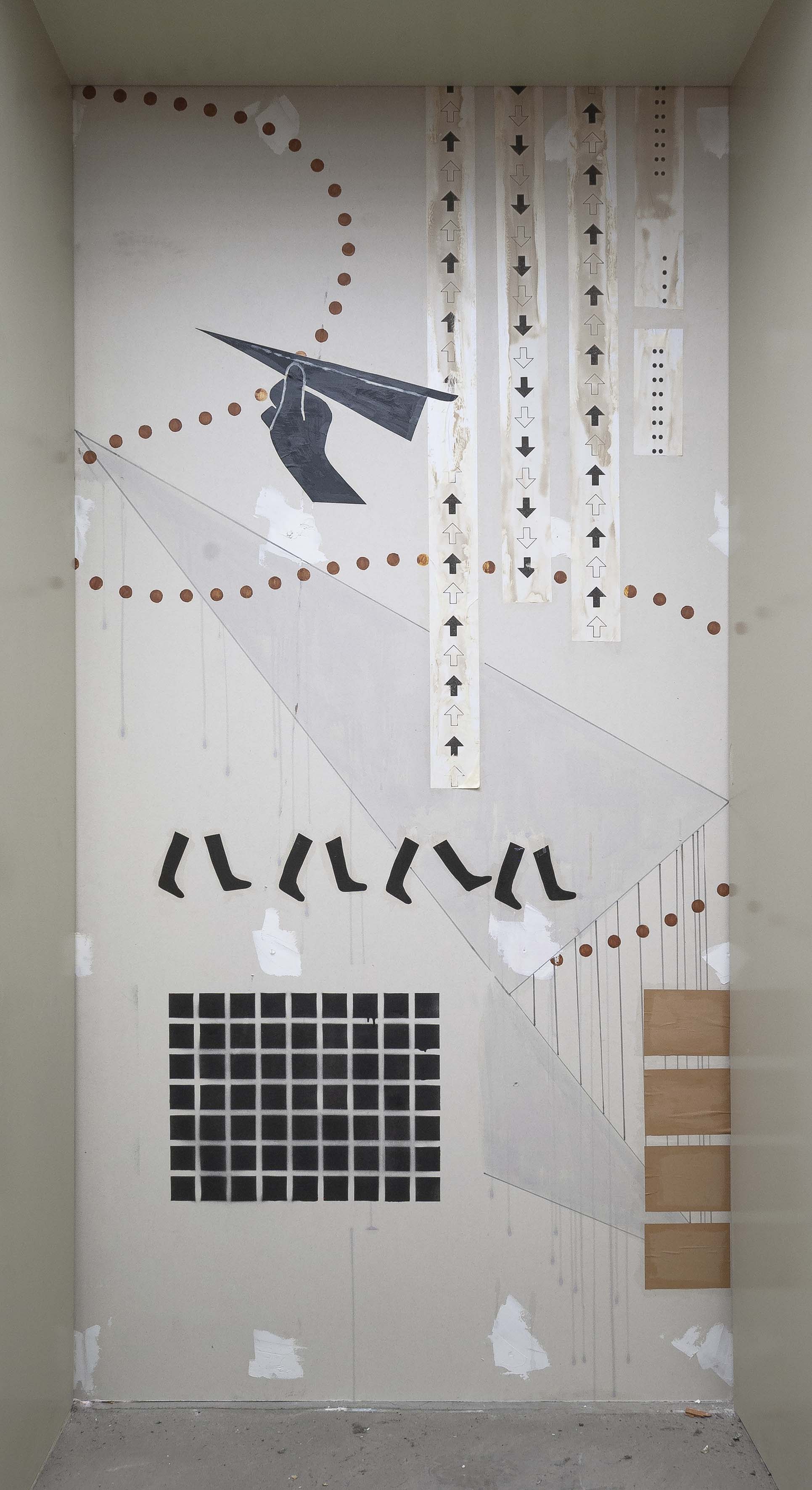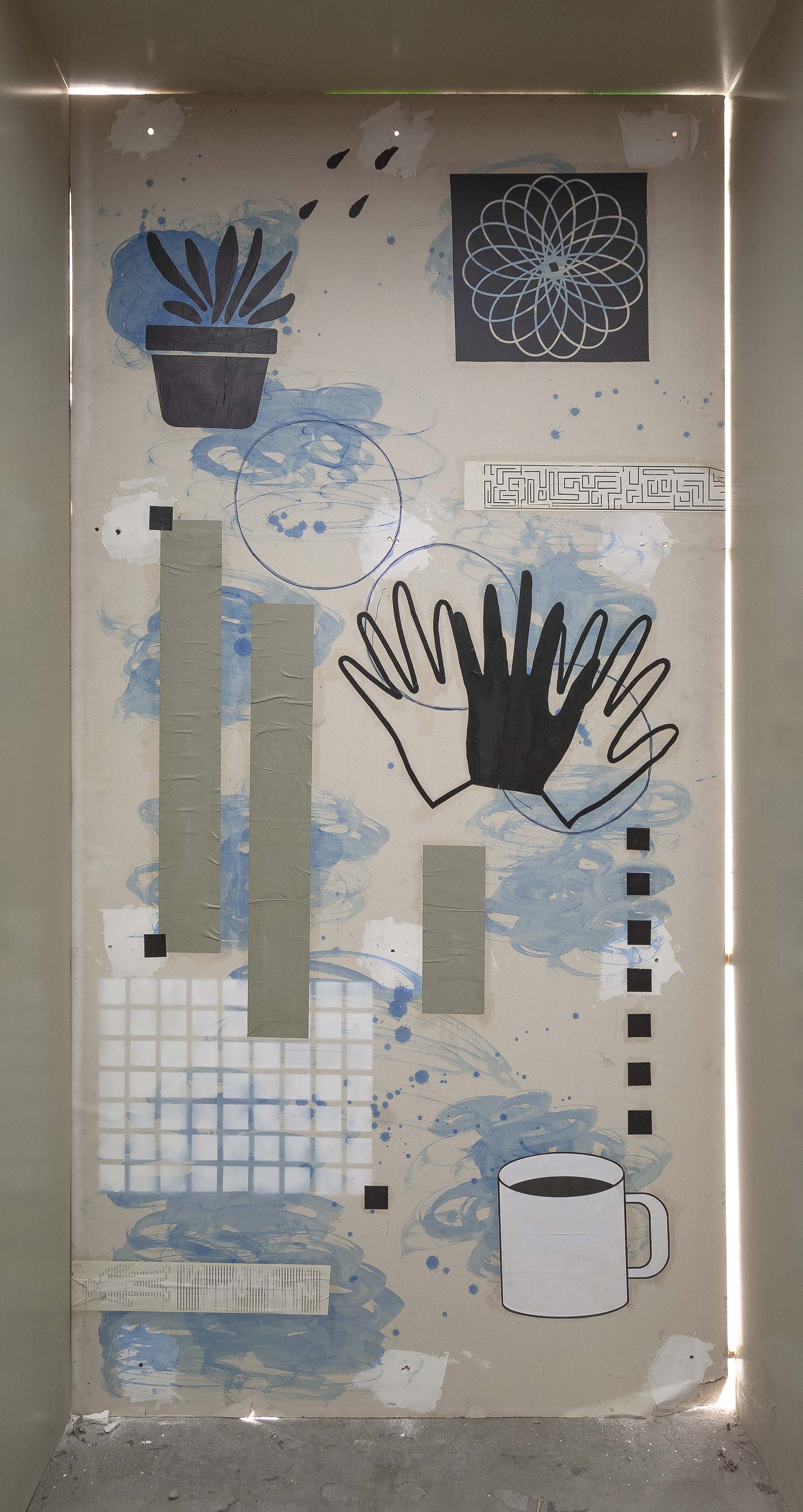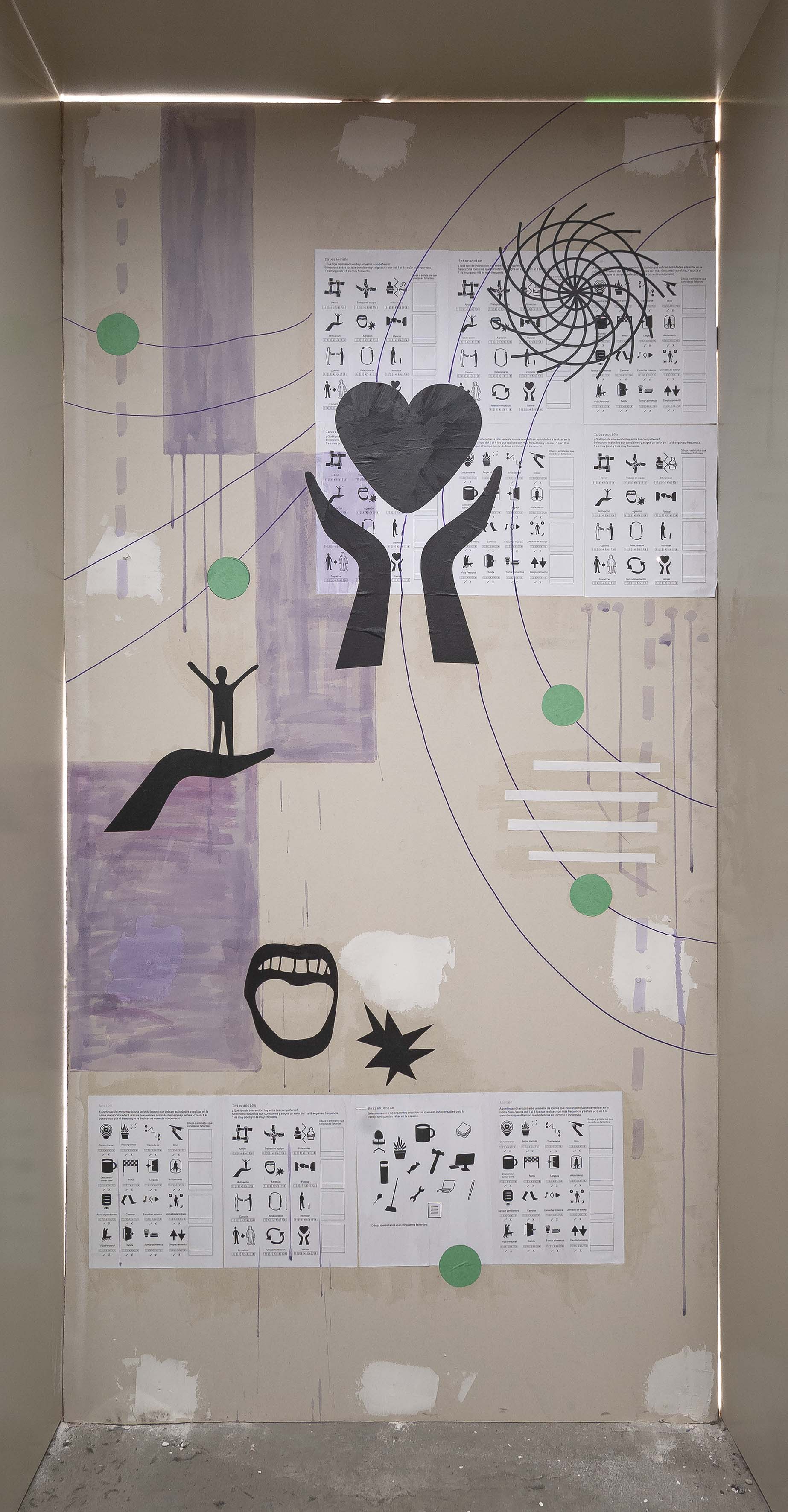 Intervención de tapiales en elevadores de la Torre UNAM Tlatelolco. Hay un total de 24 tapiales intervenidos, 4 piezas por cada piso vacío que son el 1°, 2°, 14°, 15°, 17°, 18°. Estos collages fueron realizados a partir de las experiencias compartidas de trabajadores de la Torre.
