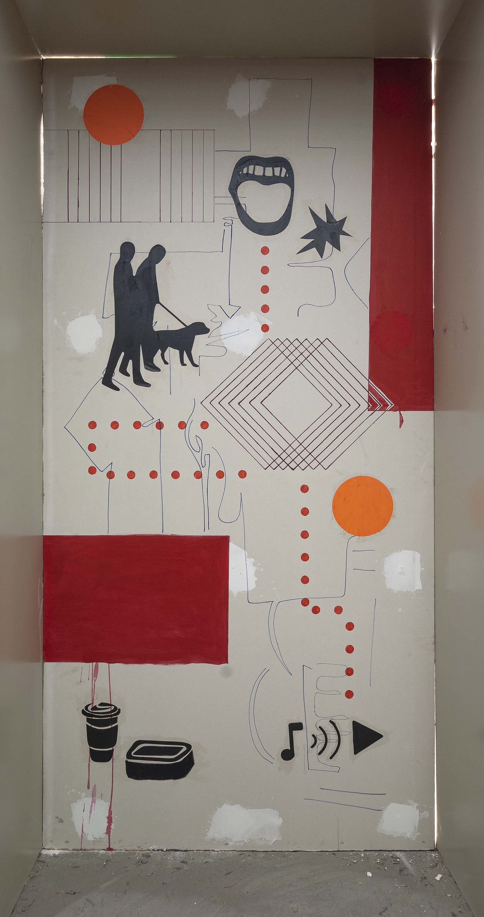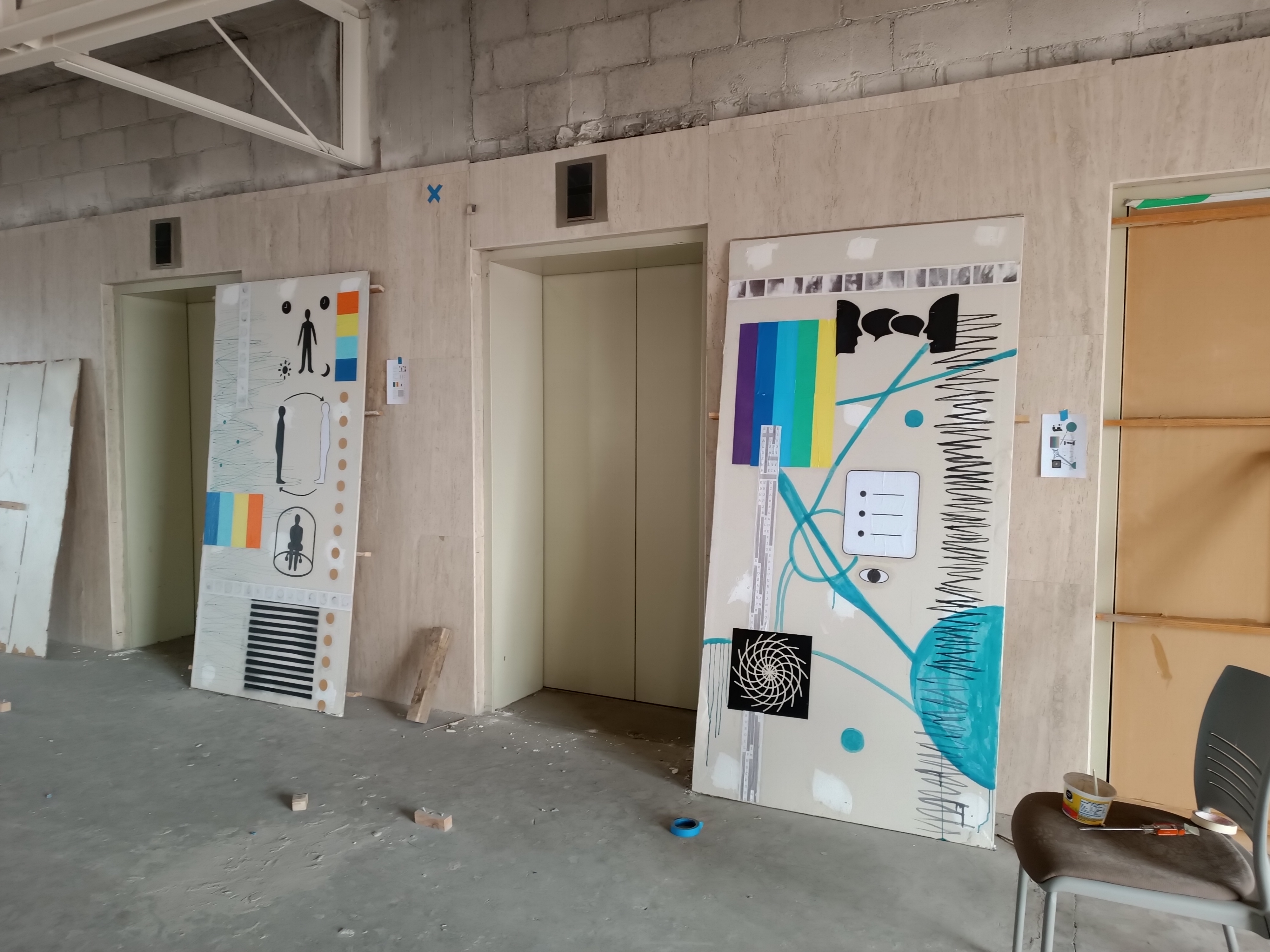 Serie de 24 tapiales intervenidos en elevadores de la Torre UNAM Tlatelolco